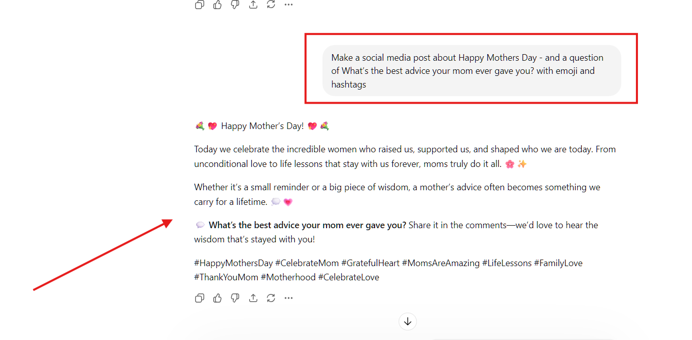 “Make a social media post about Happy Mothers Day. Include this question: ‘What’s the best advice your mom ever gave you?’ Make it engaging, add emojis, and include relevant hashtags.”